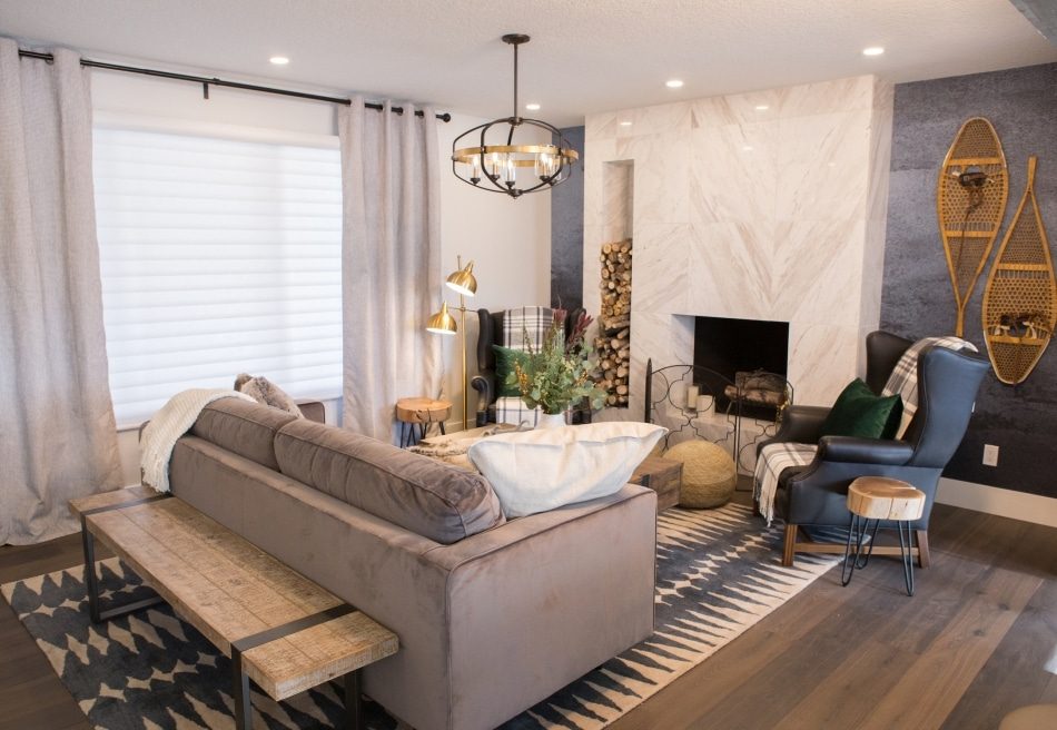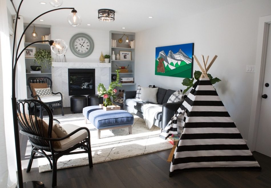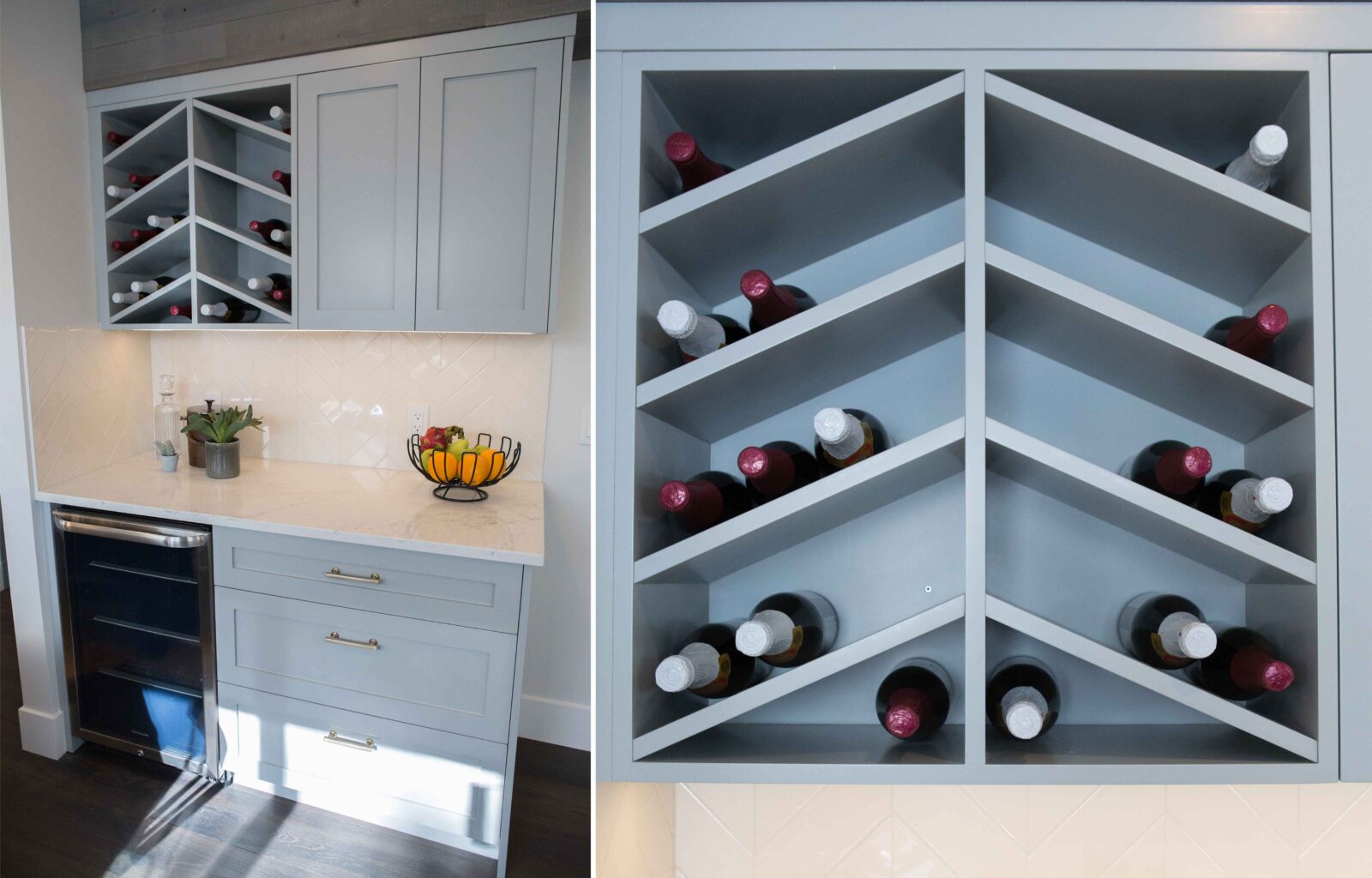 If you blinked while watching the episode, you might’ve missed a custom feature between the kitchen and dining room. Shauna and Steve wanted wanted an abundance of storage, so we built this bonus cabinet area—just for grown-ups! Here they can safely store their wine collection and items like dog food that need to be kept out of the kids’ reach. We love how the diagonal shelving subtly echoes the chevron backsplash in the kitchen.
