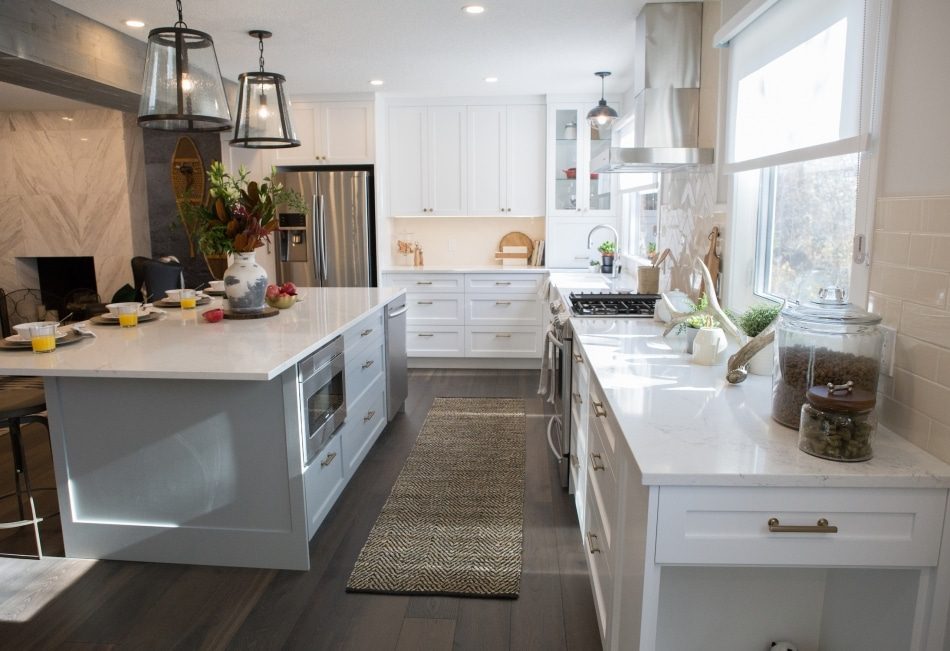 Shauna and Steve were determined to find a large home in a sought-after neighborhood near their family. With such a specific need, their healthy budget came in handy—because the few options available all needed a significant amount of work. The five-bedroom they settled on sits on a huge lot and has two separate living spaces, but the layout was incredibly choppy and some areas hadn’t been updated since the 1980s! We removed two walls on the main floor, opening up the space and giving these parents-of-two clear sightlines (i.e., the ability to keep tabs on the kids) from the kitchen.