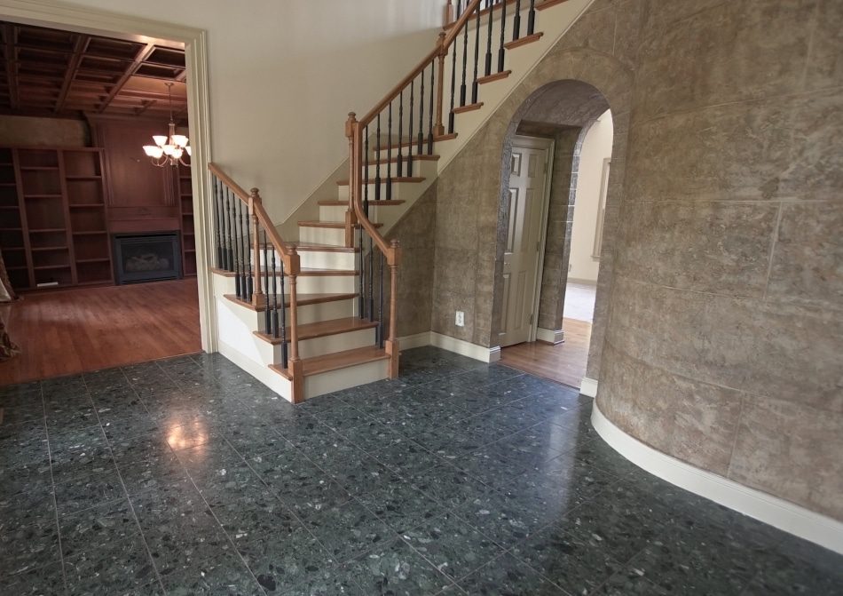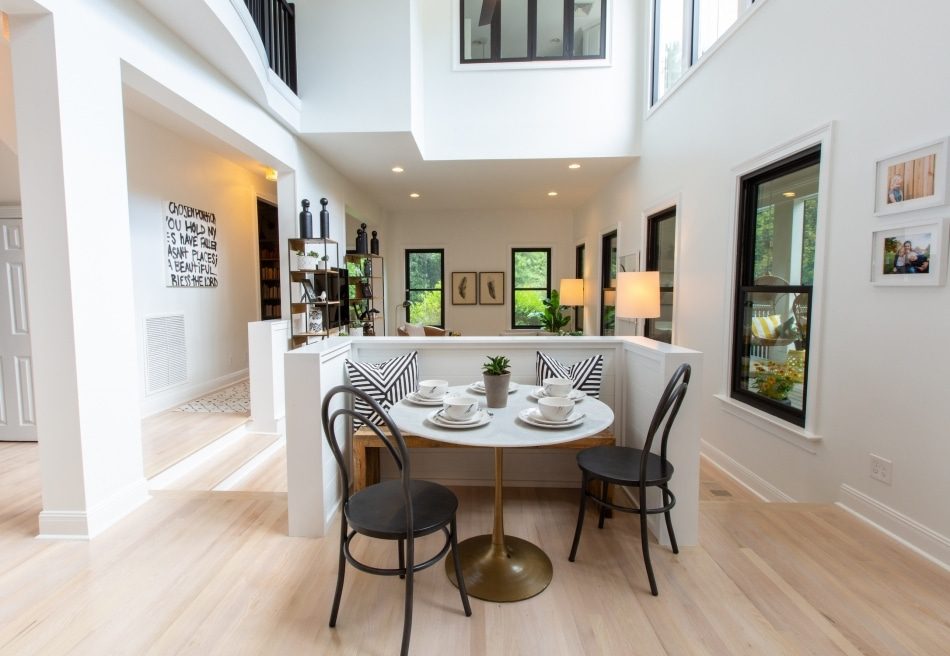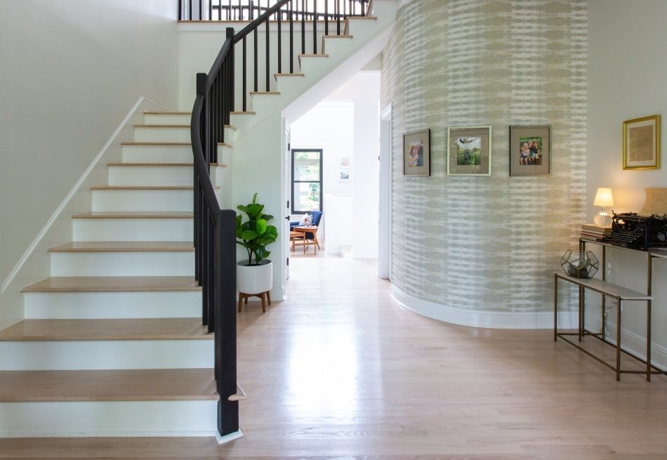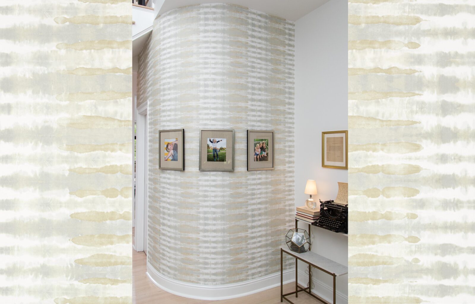 The two-story entryway’s curved wall threw us a curveball. We ended up using an ikat-printed wallpaper from Thibaut to turn it into an accent wall and then further highlighted this unique feature with negative space through the use of white paint. We also added a curved handrail and stair design to the staircase to complement the rounded wall.