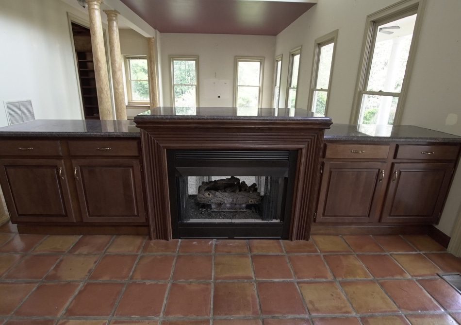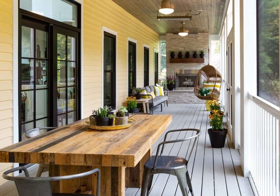 To make the home’s indoor aesthetic flow easily into the outdoor space, we set up a cozy oasis on the back patio. In addition to the mosquito-proof screening, we installed a new wood-burning fireplace with a gorgeous stone hearth and custom wood mantel. It’s the perfect setting for friends and neighbors to gather for lemonade in the summer, s’mores in the fall, and good times no matter what time of year.