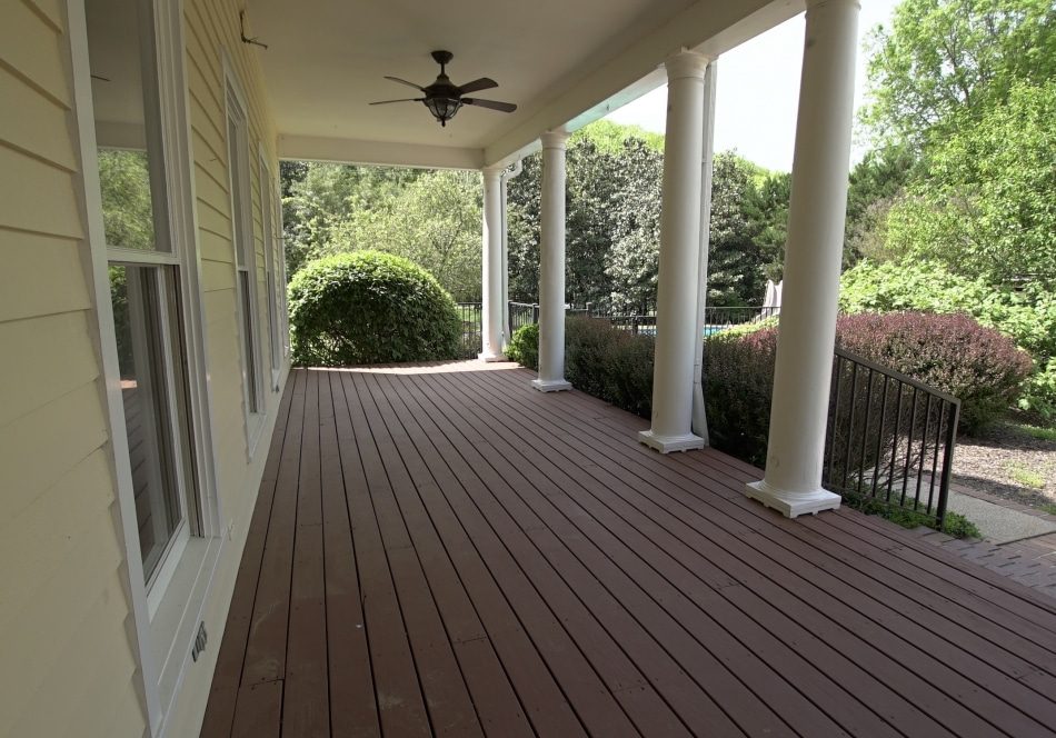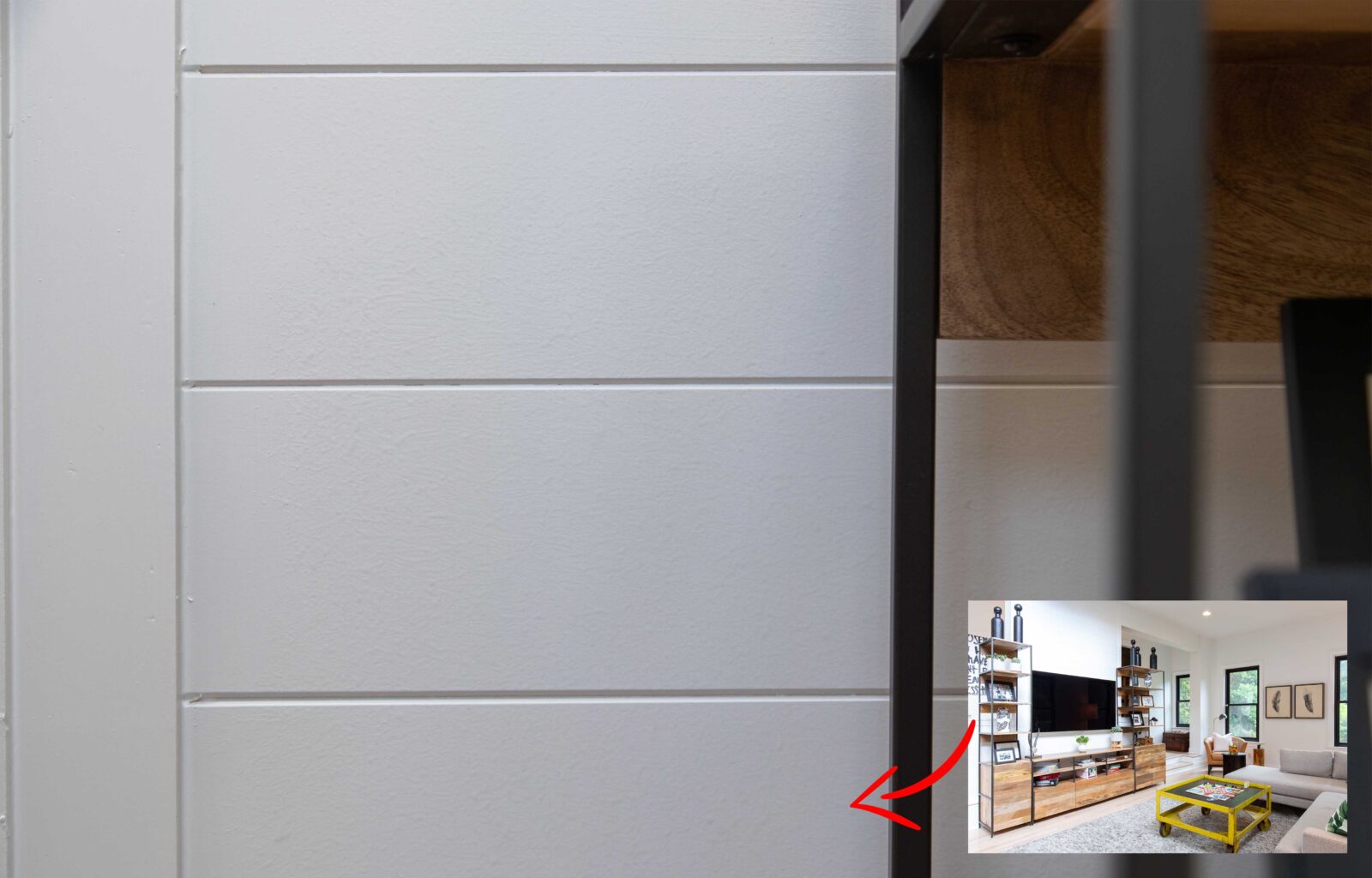 We removed the row of neoclassical columns throughout the main floor and installed a steel beam for support in the kitchen, but we needed to add a more cost-friendly point of support in the family room. So we created a white shiplap-clad wall with a floating media center—if you didn’t know that it needed to be there, you’d think it was a natural part of the design. And we didn’t stop there with the shiplap! We incorporated the same style into the sides of the kitchen banquette and a bourbon-hued version out back on the patio ceiling.
