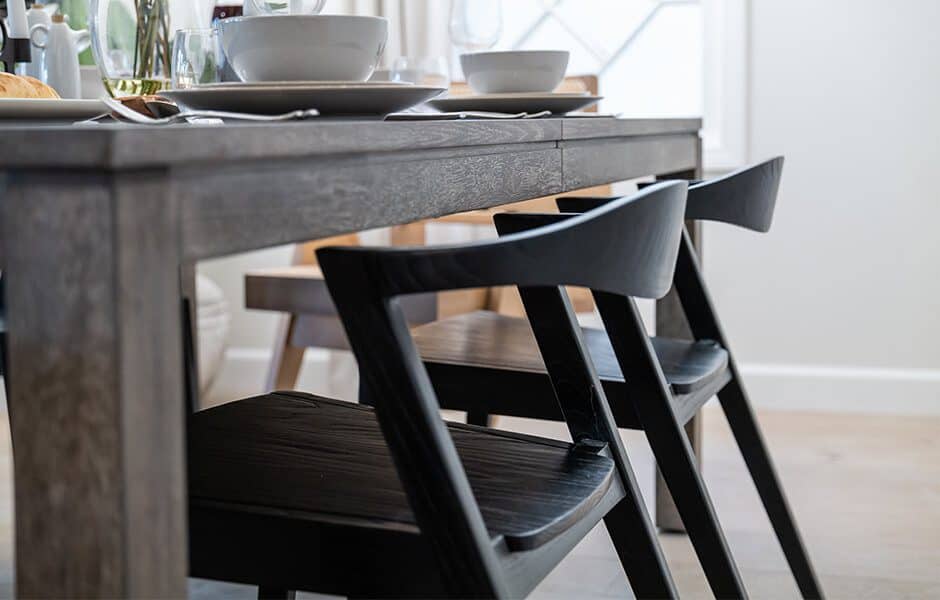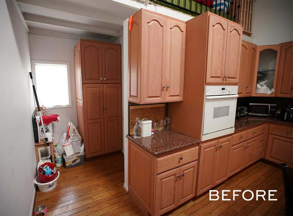 In addition to the fireplace, Tammy requested earth-tones in the kitchen, so we went with Benjamin Moore’s Army Green on the island and nearby bar (more on that in a minute) to weave the natural look throughout the second floor. (Those wood chairs at the island help, too!)