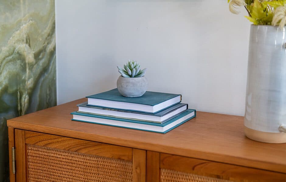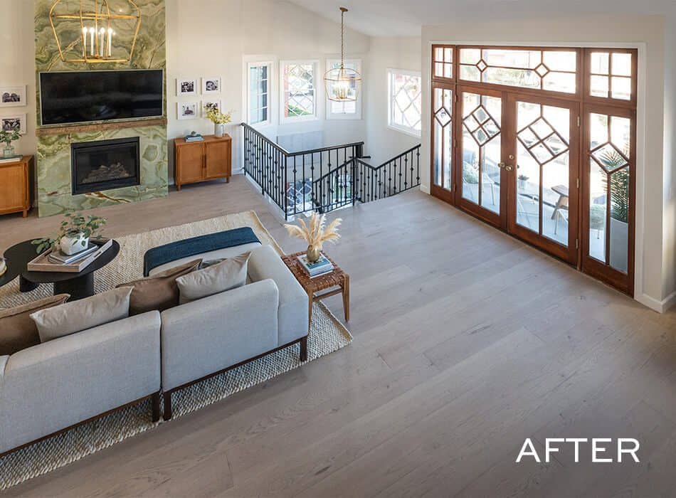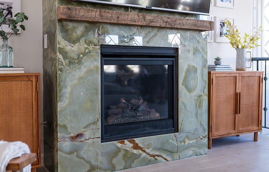 Tammy & Dimiter had hung their TV in this same spot previously, but it looked pretty lonely, and the oversized furniture still felt a bit lost in the home’s large, open layout. Tammy wanted a statement fireplace, and certainly gave her one: a green onyx feature, flanked by side consoles to better define the space and create more storage options.