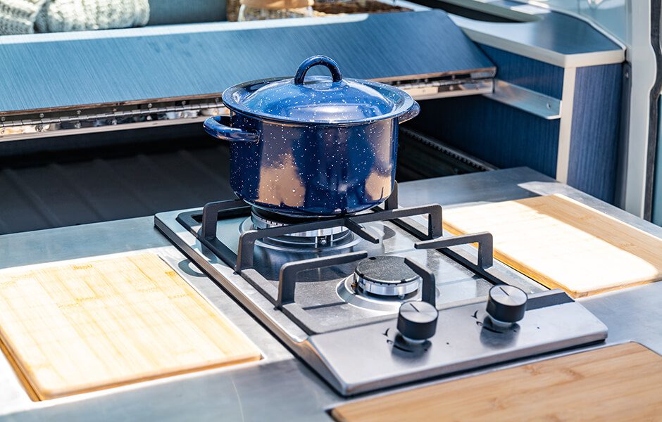 Galina’s previous car was a retrofitted Honda Element that she tried to make into a camper with a wooden pallet table, but it wasn’t quite working. Tony wanted to give her the real deal, so we created a custom roll-out kitchen that would extend from the back and provide everything she needed for a real, home (er, road)-cooked meal. You can see the full extension further down in the post.