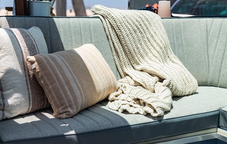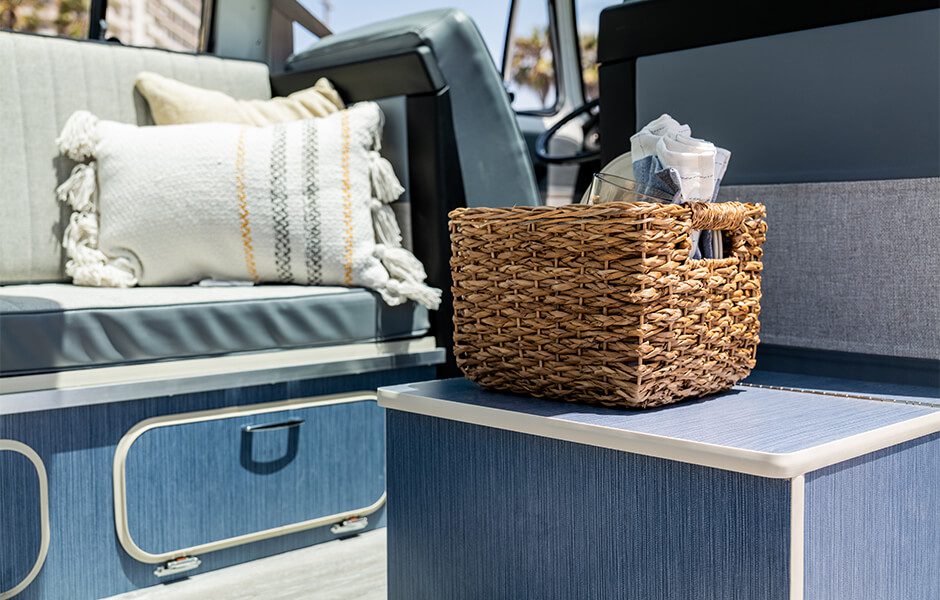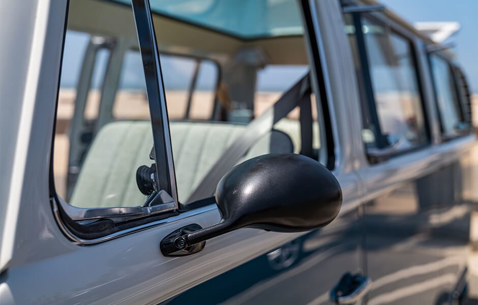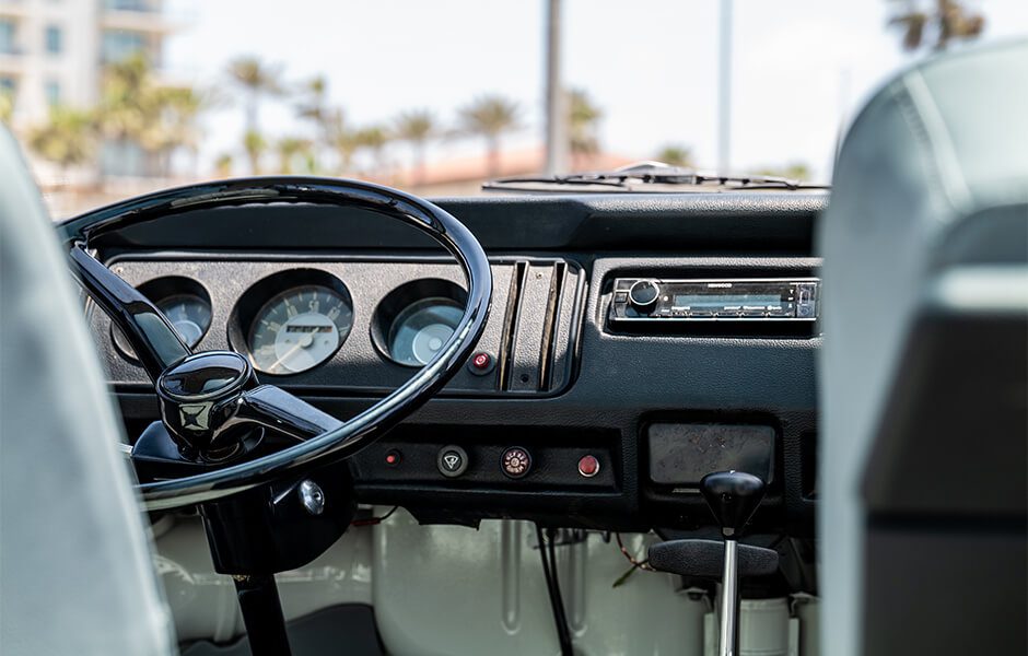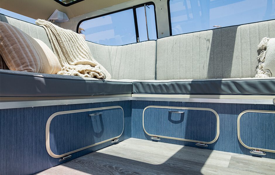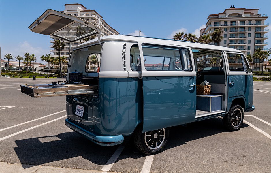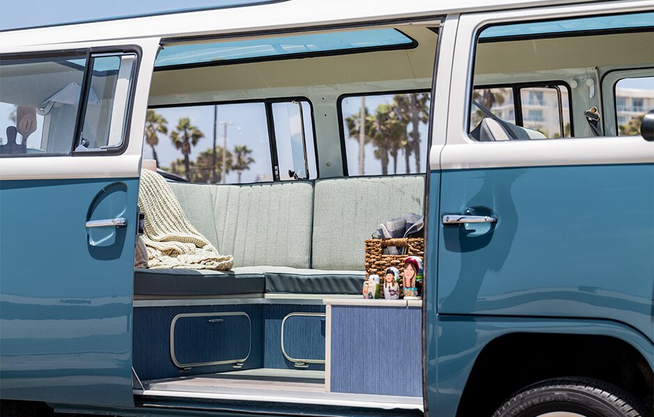 The revamped VW van looks amazing to drive, in no small part because we dropped the bumpers and installed new taillights for a seamless look. But that wasn’t the only thing we cut—no, we took out most of the roof to install an acrylic moonroof that gives all kinds of space for dreaming under the stars.
