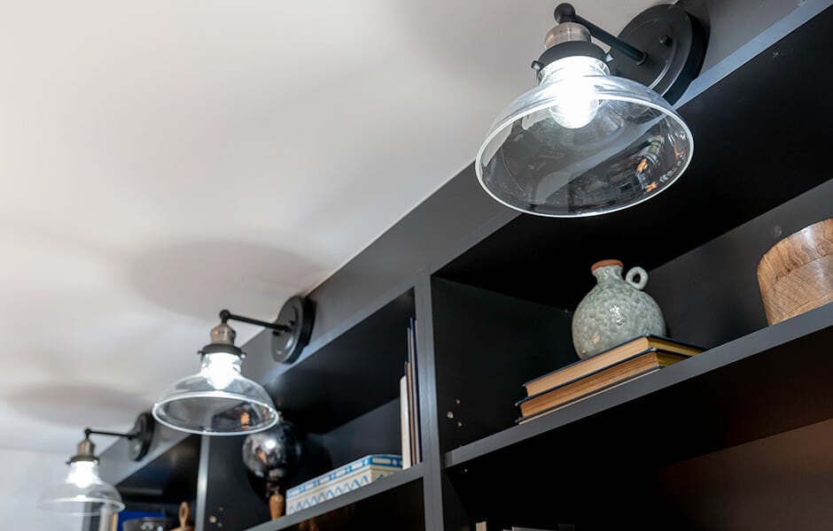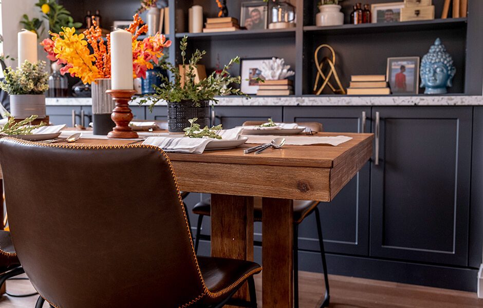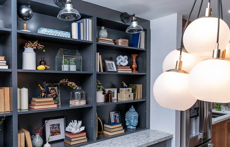 The guys mentioned they were into comics as collectibles, so we wanted them to have a space where they could show off their most prized possessions … and throw in a few sentimental items, too! These built-ins provide plenty of storage for hosting big meals with family and friends, while creating lots of room for dinner conversation pieces.