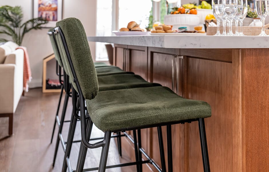 Waylon and Adam had billed themselves as polar opposites when it came to design, but once we went through our inspiration-home tour, it turns out they weren’t as far apart as they thought. They both liked an updated traditional look that was low on drama and high on functionality. We delivered the whole package in the kitchen with warm tones and cabinets that took advantage of the wasted space in their previous layout, in addition to an island that replaced a dividing wall.