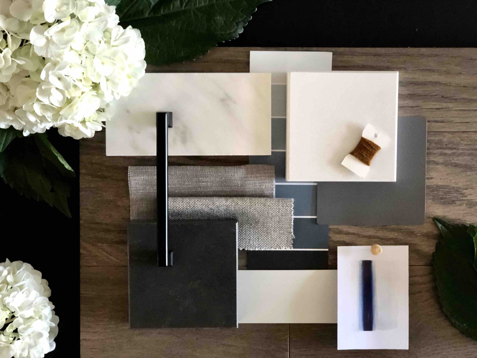 Flat lay of design elements including a white cabinet door, marble sample, pink roses, a green monstera leaf, and woven textures