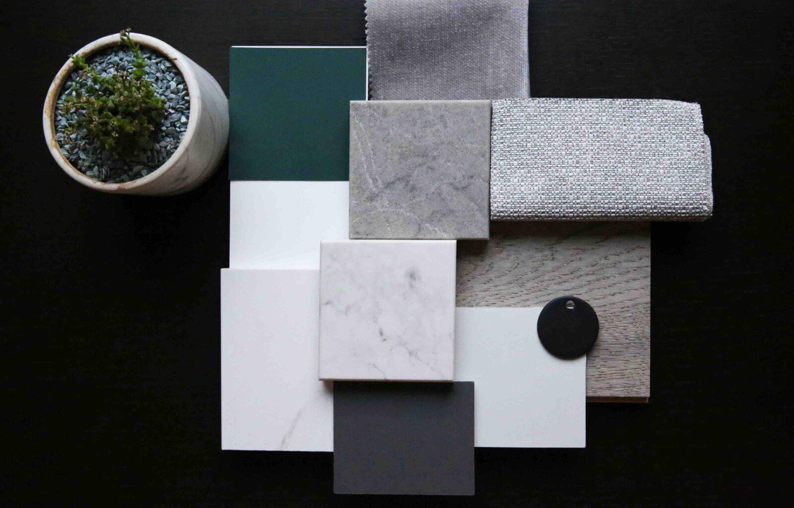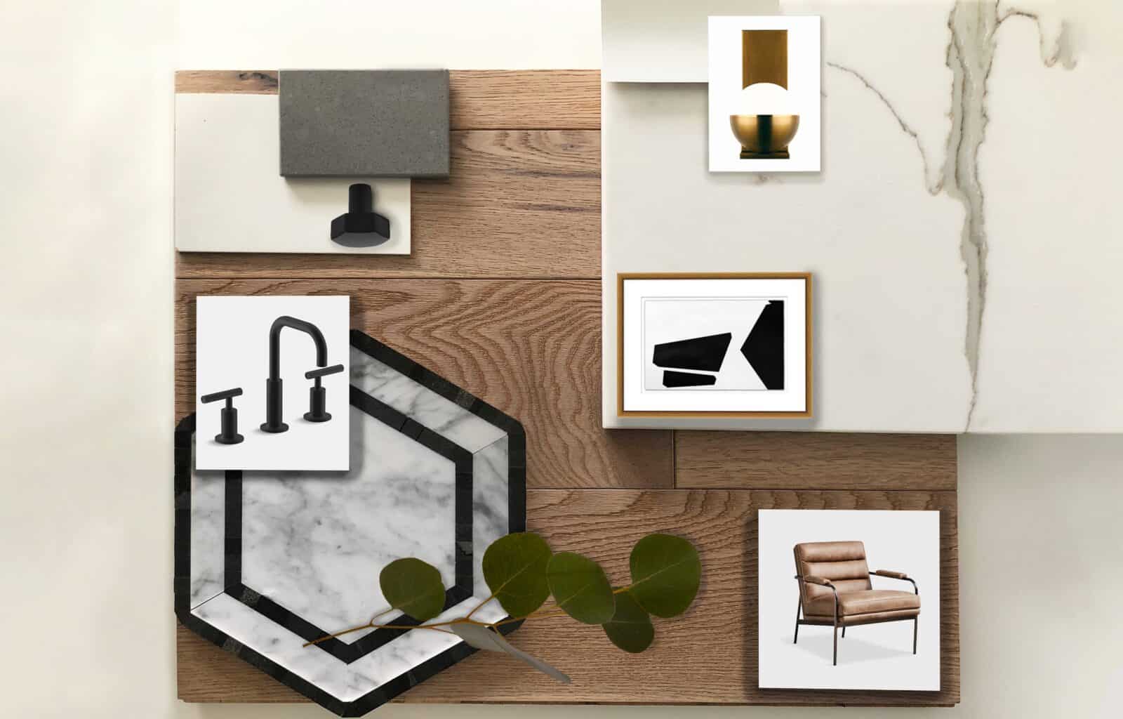 A mood board featuring various like marble, wood, tile, fabric swatches, a star decoration, and a framed photo