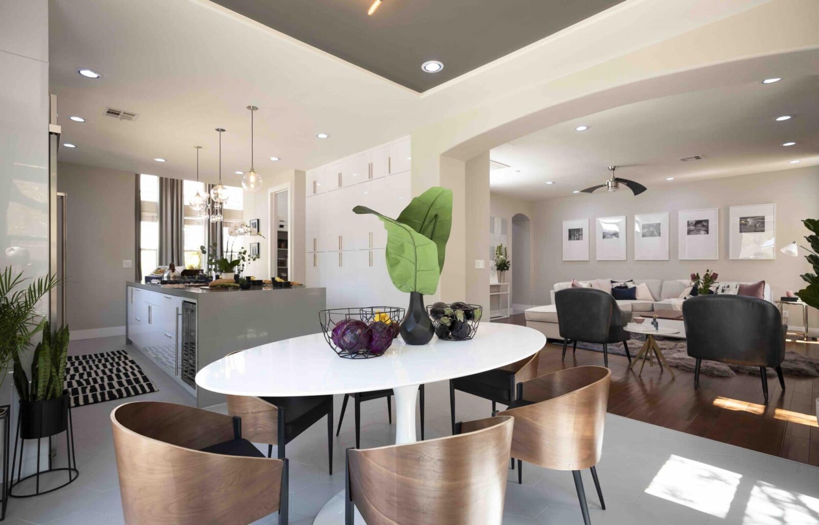 Stylish dining nook with round gold table, green chairs, bench seating, modern lighting, and bold wall art