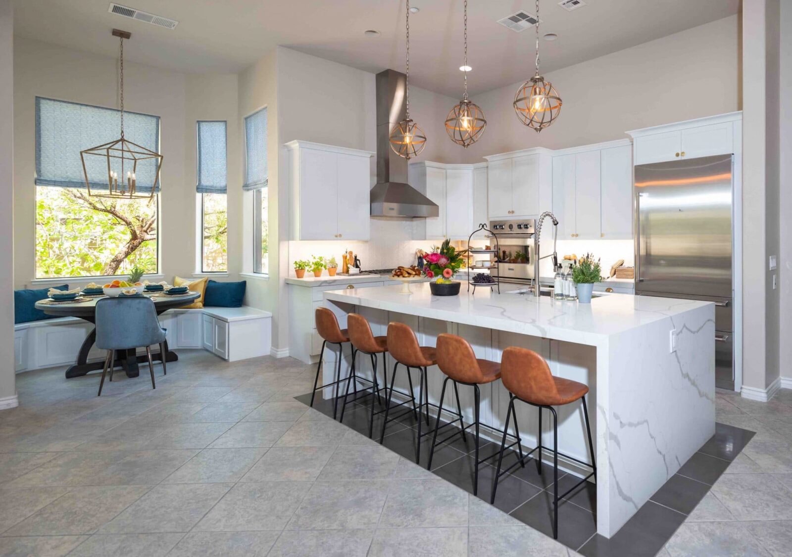 Elegant kitchen with green island, gold accents, geometric pendant lights, and white cabinetry